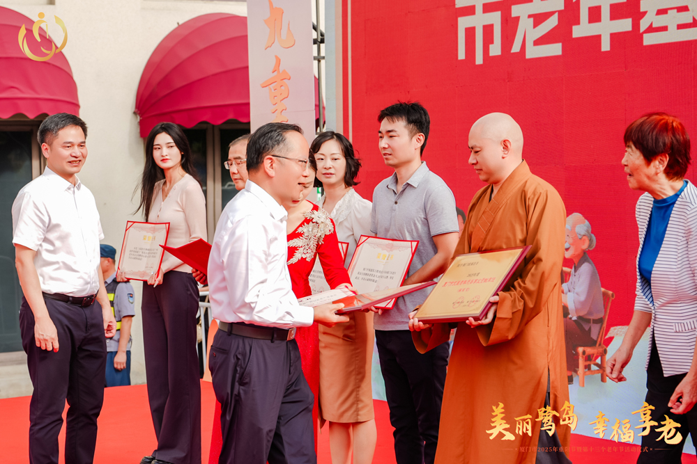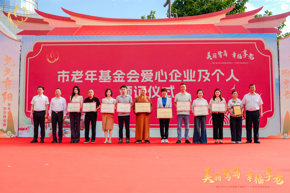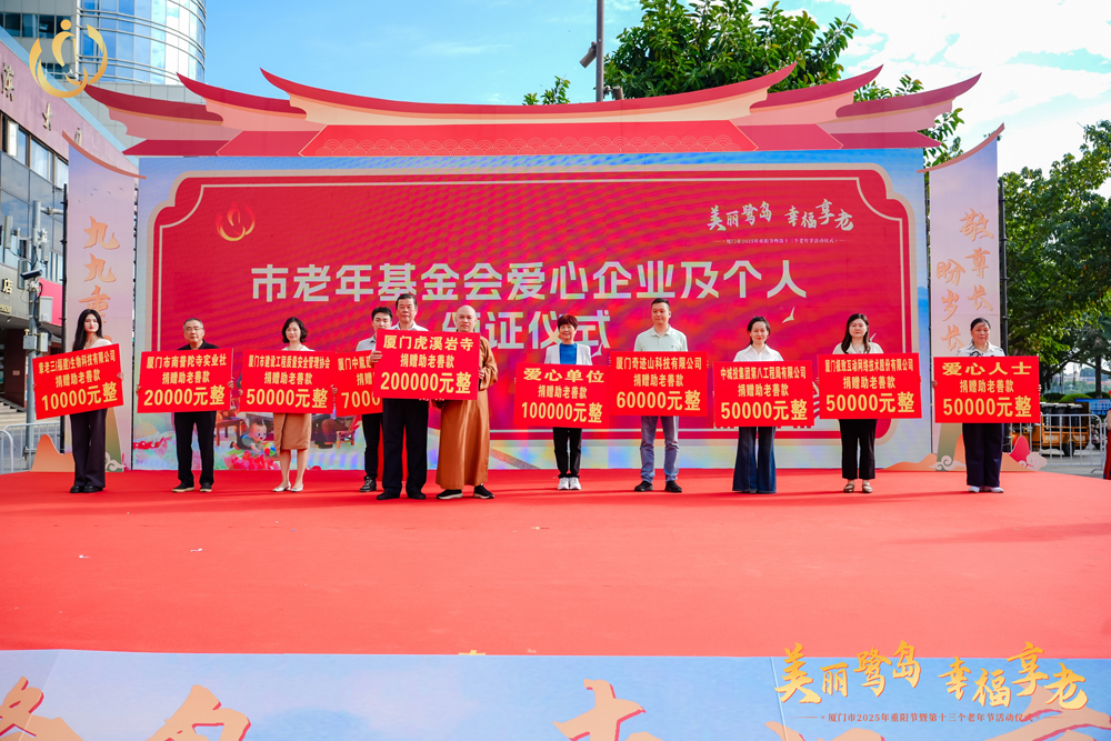 10月29日下午,在“厦门市庆祝2025年重阳节暨第十三个老年节活动仪式”现场,由市委文明办、市民政局、厦门日报社与本会共同发起的2025年“重阳敬老 你我同行”——第十五届新闻大篷车重阳节特别行动借助全市庆祝老年节大会举行启动仪式。厦门虎溪岩寺、厦门中胤建筑工程有限公司、厦门奇迹山科技有限公司、中城投集团第八工程局有限公司、厦门极致互动网络技术股份有限公司、厦门市建设工程质量安全管理协会、厦门市南普陀寺实业社、章老三(福建)生物科技有限公司等爱心单位和爱心人士代表现场举牌,向本会捐赠爱心款项,李建福会长代表本会接受捐赠,市政府副市长廖华生、市民政局局长洪全艺和李会长共同为爱心单位、爱心人士颁发荣誉牌匾及证书。